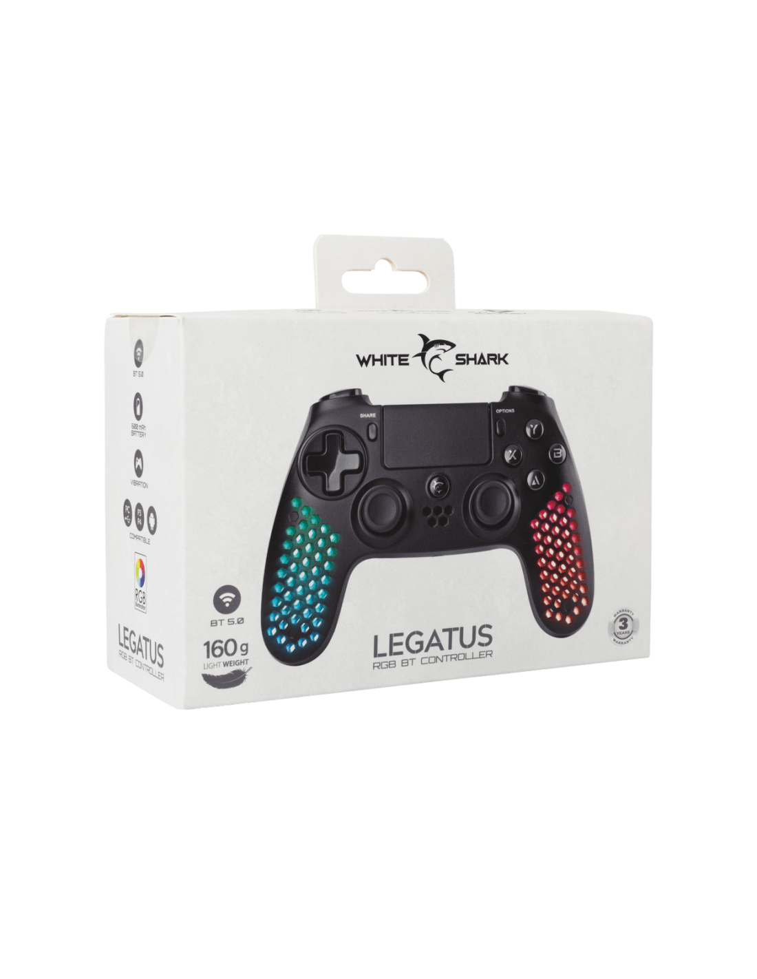 Dominate the game with the White Shark Legatus gamepad. Designed for ultimate comfort and precision, this gamepad offers an immersive gaming experience. Featuring a responsive D-pad, dual analog sticks, and 15 action buttons, you'll have complete control over your gameplay. Immerse yourself in the action with powerful vibrations and customizable RGB lighting with 4 effects and 8 colors. Connect seamlessly to your PS4, PS3, PC, Android, or iOS device with Bluetooth 5.0 technology.